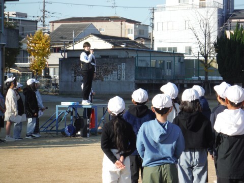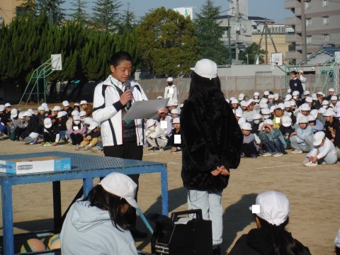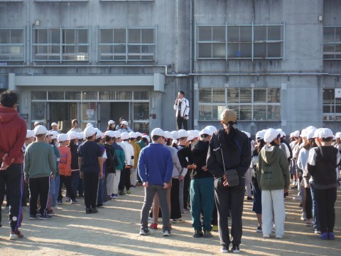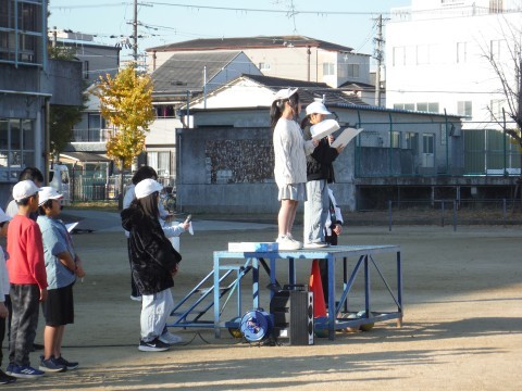 12月の全校朝礼を運動場でおこないました。はじめに,校長先生からのお話がありました。6年生が参加したにんげん学習交流会についてのお話,12月4日から10日までの人権週間についてのお話がありました。次に12月の生活目標「感染を予防しよう。」と,強い体づくりについてのお話がありました。そして,児童会からは赤い羽根募金についてのお知らせがありました。そして,よりよい生活について人権についてのお話がありました。最後に,表彰がありました。受賞したみなさん,おめでとうございます。