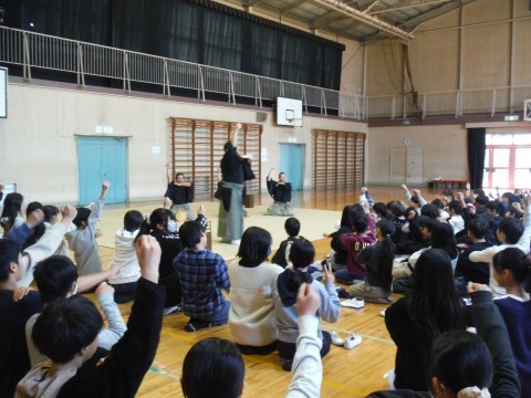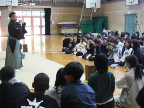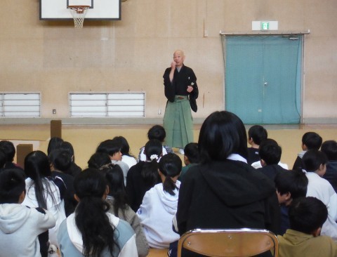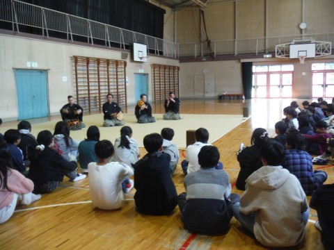 今日は,さかいミーツアート事業を本校で実施していただきました。本日は,能・狂言という伝統芸能をまじかに体験することができました。能で使われる楽器,笛,小鼓,大鼓,太鼓の音の出し方や声の出し方,どんな楽器なのかについてなどを教えていただきました。伝統芸能が,こんなに面白かったんだと改めて感じることができたのではないでしょうか。本日は,ありがとうございました。