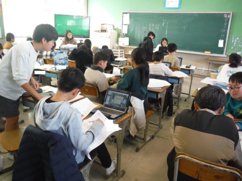 (上の写真)今日は,お楽しみ会の準備をしていました。教室に飾るかざりや出し物,クイズ作りなど,どの役割を担当しているグループもてきぱきとすすめていました。(中の写真)こちらでは,みんなでサプライズを考えているようでした。誰に,どんなサプライズか楽しみですね。成功するとよいですね。(下の写真)家庭科の時間の様子です。今日は,ミシンのところのテストを返却していました。どこが間違えたのかをしっかりと直していました。
