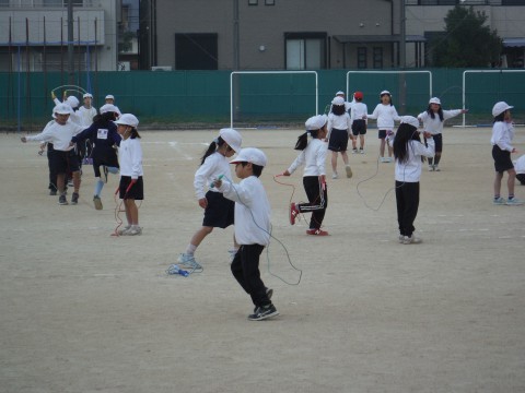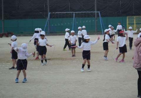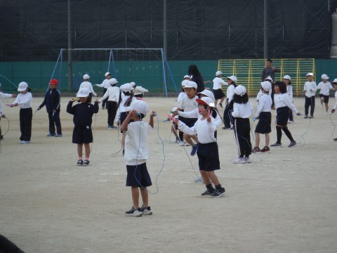 学年での体育の時間の様子です。今日は,みんなでなわとびをしていました。前跳びや後ろ跳びなどを練習していたようです。回数や跳ぶ種類など少しでも上達することができたらよいですね。