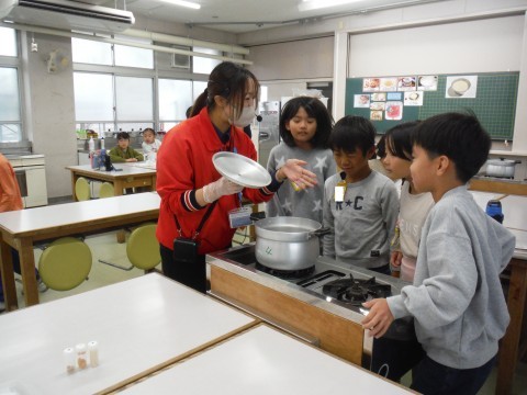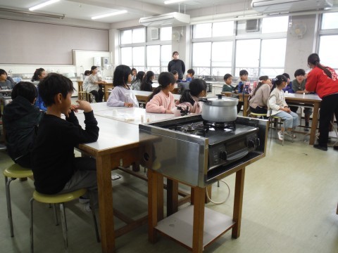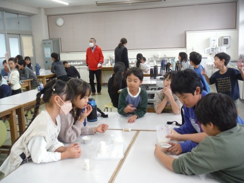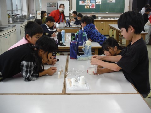 今日は,出前授業を各クラスでおこないました。豆腐のことについて教えていただきました。実際に,豆乳ににがり入れ,10回くらいそっと混ぜていました。混ぜたものをアルミホイルのカップに入れ替え,湯せんをしました。みんな興味しんしんでした!!