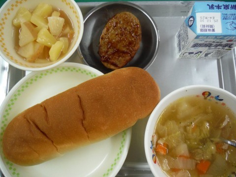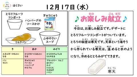 今日の給食の献立です!!今日は,お楽しみ献立です。デザートにコンポートがついていましたよ。