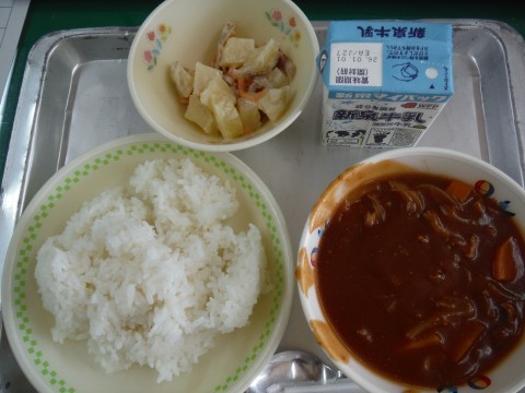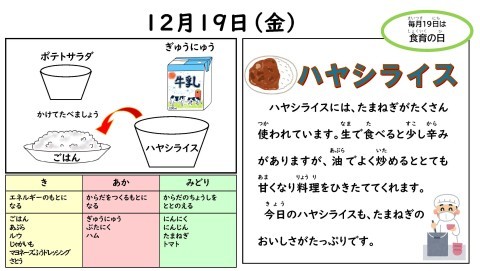 今日の給食の献立です!!今日はハヤシライスです。とっても人気のメニューですよ。