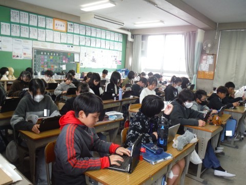 (上の写真)社会の時間の様子です。今日は,歴史新聞の作成とともに,日本と関係が深い国々について調べていました。アメリカや韓国などの様々な国やまずは自分の国からと日本についても調べている児童がいました。(下の写真)音楽の時間の様子です。今日は,卒業コンサートに向けての練習に取り組んでいました。録音した曲を聞き,曲の速さや自分の楽器の演奏の課題について考え,さらに練習に励みました。
