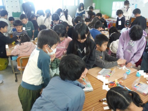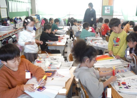 (上の写真)今日は,2学期に生活科や国語などで学習したことをファイルに整理をしました。どんな勉強をしていたのか2学期を振り返ることができますね。(中の写真)図工の時間の様子です。今日は,昔遊びで遊ぶ凧の絵を描きました。自分が好きなものを描いたり,模様などをダイナミックに描いたりしていました。(下の写真)今日は,2年生から凧の作り方を教えてもらいました。紙コップの切ったりやペットボトルの蓋の付けたり,なかよくこまを作りましたよ!!