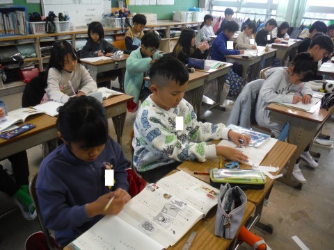 (上の写真)算数の時間の様子です。今日は,重さの表し方について学びました。実際に,1グラムである1円玉をもち「すごく軽い。」との感想でした。1円玉が何枚とものの重さを測りました。(下の写真)国語の時間の様子です。4コマの絵を並び替えて,物語を作っていました。絵をみながらどんなお話にしようかと考えていましたよ。