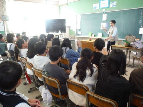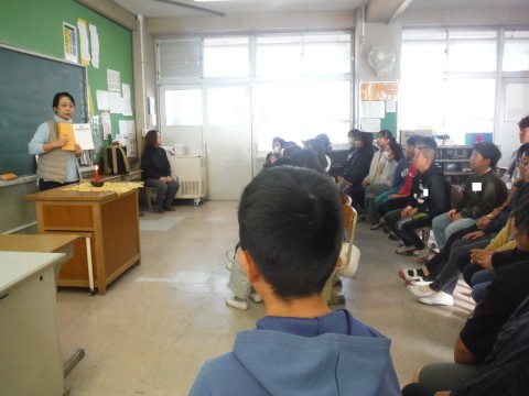 今日は,お話花束の会の方にきていただき,読み聞かせをしていただきました。いくつものお話を紹介していただきました。中には,「河豚」「海鼠」・・・などの生き物の漢字の本があり,「うーん」と懸命に考えていました。本日もありがとうございました。
