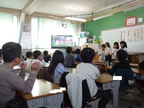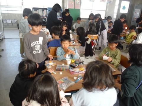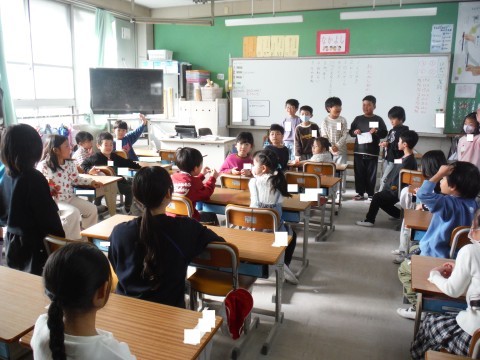 (上の写真)クラスでお楽しみ会をしていました。ヒントを出しながらクイズをしていました。正解した人で,じゃんけんで勝つとおみくじを引くことができるようです!!(中の写真)こちらでもお楽しみ会をしていました。ちょうど歌を歌っていました。とっても上手にうたったいました。リズムにノリノリでした。(下の写真)こちらでは,2年生から「こま」づくりを教わっていました。2年生が,鉛筆で切り取り線を書いた紙コップを1年生に手渡しているところやそれを懸命に切っている姿などとっても温かい雰囲気でした。