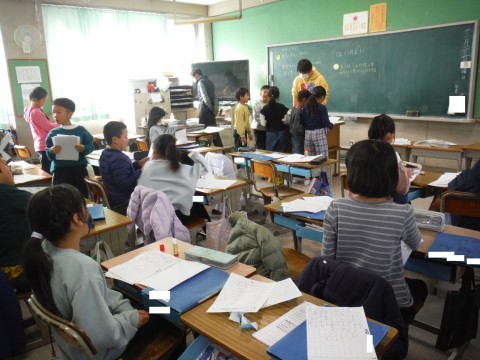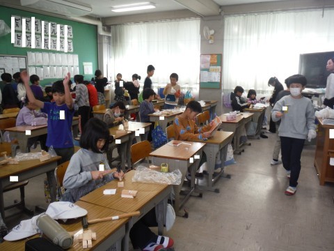 (上の写真)こちらでは,プリントの整理をしていましたよ。返却されたものを確認し,青いファイルにしまっていました。配りさんありがとうございます。(下の写真)こちらでは,図工で立体物をつくる作業と次の時間のお楽しみ会との準備をしていました。次の時間が楽しみですね。