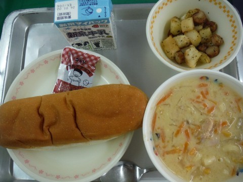 今日の給食の献立です!!パンにつけて食べるチョコレートクリームがあり,とっても嬉しそうでした!!