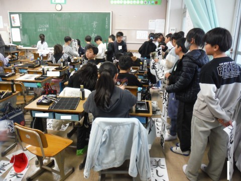 (上の写真)国語の時間の様子です。今日は,1つの言葉を決め,その言葉から連想できるものを想像しながら,マップ図にあらわしていました。(中の写真)書写の時間の様子です。今日は,書初め,条幅紙で「美しい空」を書きました。「美」の漢字に注意しながら丁寧に書き,先生に確認してもらいました。(下の写真)音楽の時間の様子です。今日は,「いつだって!」という歌をはじめて習いました。どんな歌かを聞いていると,自然とそのリズムにのりながら口ずさんでいました。