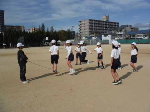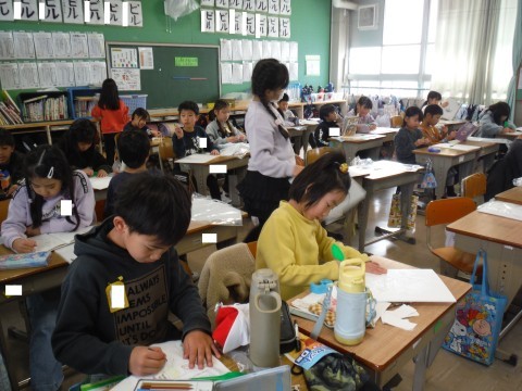 (上の写真)体育の時間の様子です。今日は,チームにわかれて,大なわをしていました。「郵便屋さん」の歌にあわせて,跳びました!!(下の写真)図工の時間の様子です。今日は,スチレン版画の下絵に取り組んでいました。スチレン版のボードに,型押しヘラを使って,動物や魚,建物のなどを描きました。