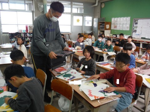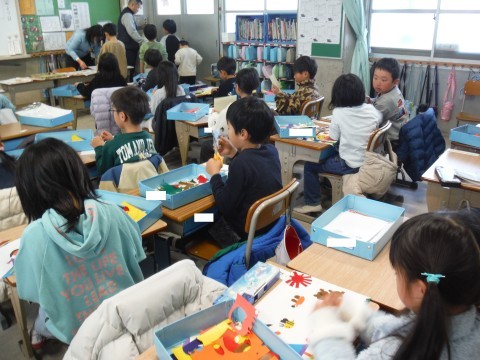 (上の写真)図工の時間の様子です。今日は,紙版画を刷っていました。色とりどりの紙を貼り,作品を仕上げていましたよ(中の写真)こちらでも図工の時間でした。今日は,紙版画の台紙に形に切り取ったものを貼りました。お友だちの作品をみて,さらに自分の作品に活かしていました。(下の写真)道徳の時間の様子です。今日は,「にほんのあそび」について考えました。お正月に遊んだ遊びも紹介していました。