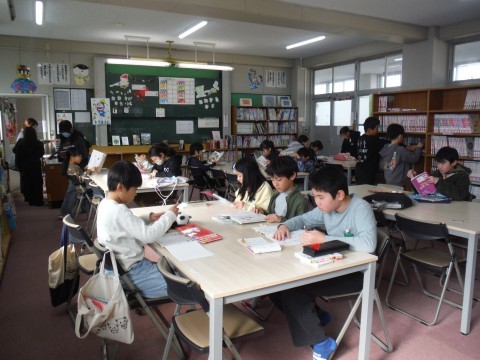 (上の写真)図書の時間の様子です。どの本を読もうかと選んでいました。選んだ児童から静かに読んでいました。新しい本がそろそろ入りますよ。(中の写真)書写の時間の様子ですよ。小筆で詩とそれに合ったイラストを半紙に書きました。味わいのある作品ができました。(下の写真)国語の時間の様子です。今日は,自分が興味をもったこと,「筆者の努力」「想像力」などを中心に要約をしていました。しっかりまとめてくださいね。