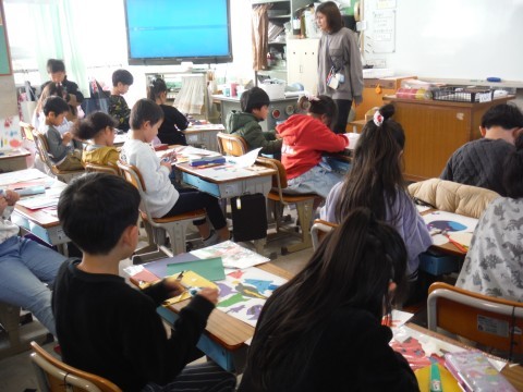 (上の写真)算数の時間の様子です。数のビンゴをするために,学校にあるものの数を探していました。ブロックや朝顔の鉢,運動場にある水道の蛇口の数などさまざまなものを数えていました。(中の写真)図工の時間の様子です。紙版画を作っています。新幹線や車がはしっている様子やサッカーボールを蹴っているところなど素敵な作品ができあがっていました。(下の写真)国語の時間の様子です。ちょうどお店屋さんごっこが終わったところでした。お店の人やお客さんのことばに気をつけたそうです。
