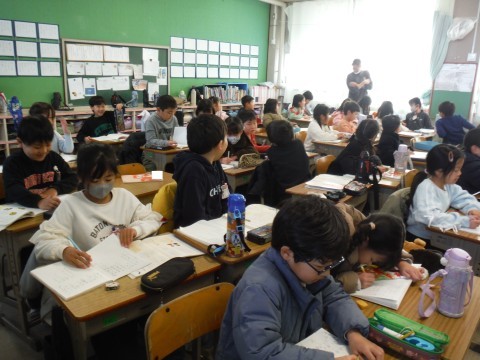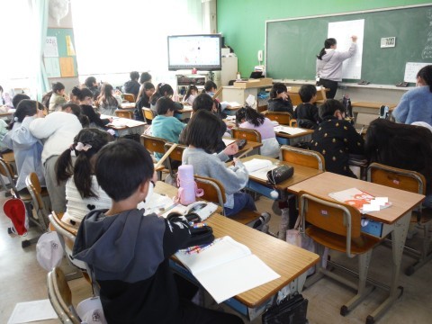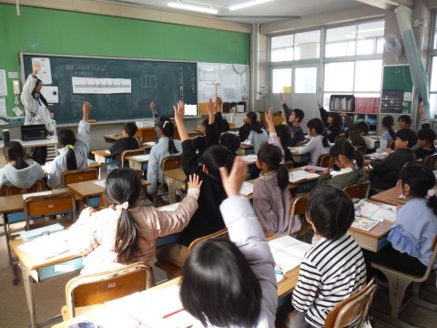 (上の写真)算数の時間の様子です。今日は,長い長さをものさしではかっていました。ものさしとものさしを合わせてはかったり,友だちの背の高さや顔などの長さをはかったりしました。(中の写真)こちらでも算数の時間の様子です。今日は,長いものの長さの表し方を考えました。1メートルの長いものさしのめもりの問題を解きました。(下の写真)国語の時間の様子です。今日は,ハンバーグについて,イメージマップで想像を広げ,詩を作りました!!満足のいく詩ができあがったようです。