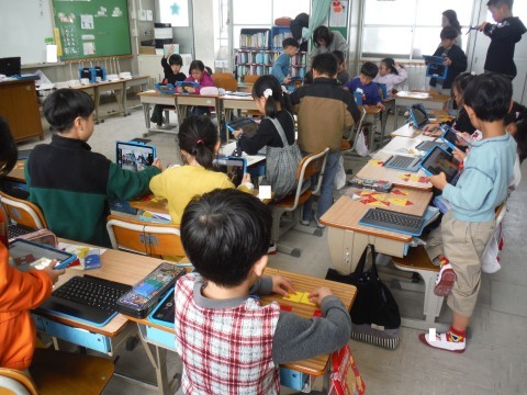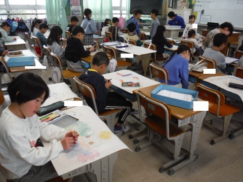 (上の写真)こちらではプリントの整理をしていましたよ。学年末になりました。4月からたくさんの勉強をしてきましたね。(中の写真)こちらでは,三角の形で作ったものを,タブレット端末を使って写真を撮り記録していました。少しずつ使い方にも慣れてくださいね。(下の写真)図工の時間の様子です。今日は,作品袋を作成していましたよ。1年生で作ったものや記録したものなどその袋の中に入りますね。思い出いっぱいの作品袋ですね。