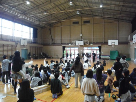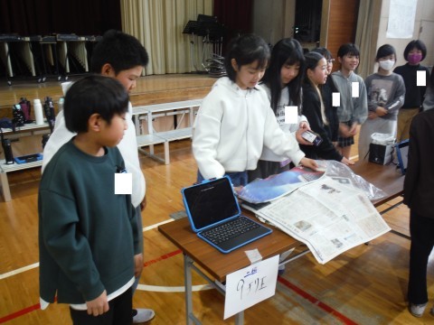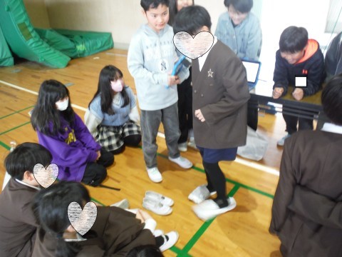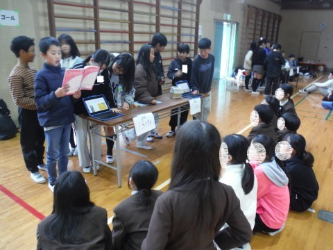 今日は,五箇荘中学校群の新浅香山小,五箇荘小,本校の3校の5年生が,体育館で交流会をおこないました。総合的な学習の時間で学んできたことを,他校のみんなに各班ごとに発表しました。本校は,「防災のグッズ」について,タブレットで作成した資料を見せたり,グッズを一緒に作ったりしました。五箇荘小は「五箇荘ミニ万博」ということで,タブレットを使いながら説明をしていました。新浅香山小は,保育体験をしたことについて,こちらでもタブレットを使いながら説明していました。同じ5年生と交流ができ充実した時となりました。