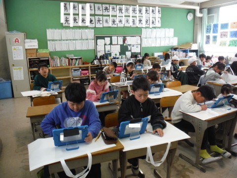 (上の写真)図工の時間の様子です。今日は,作品袋を作成していましたよ。どんな絵を描こうかと調べながらかいていました。(下の写真)算数の時間の様子です。今日は,「三角形と角」の学習のまとめの問題を解いていました。