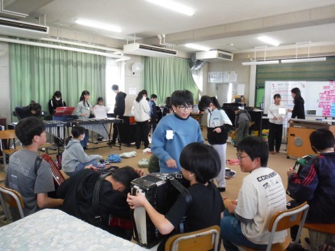 (上の写真)音楽の時間の様子です。今日は,「キリマンジャロ」の合奏の練習をしていました。担当していた楽器とは別の楽器で練習していたようです。(中の写真)道徳の時間の様子です。今日は,「思いやり」について考えていました。グループで活発な意見交流をしていました。(下の写真)こちらでは,作品袋に,1年間の図工の作品や書写などの成果物を整理していました。もうすぐ5年生が終わりますね。