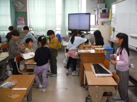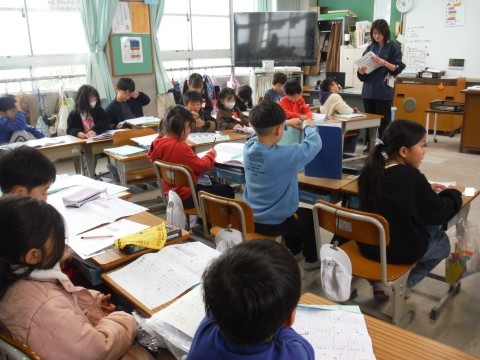 (上の写真)ちょうどお楽しみ会をしていました。クイズをみんなに出題していました。ヒントをもらいながら答えを考えていました。(中の写真)こちらではテスト返しをしていました。「次のテストは自信ある!!」と返却を楽しみにしていました。(下の写真)こちらではお楽しみ会の出し物の練習や必要なものを作成したいたようです。どんな出し物か楽しみですね。