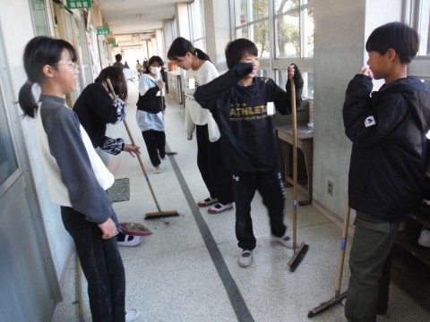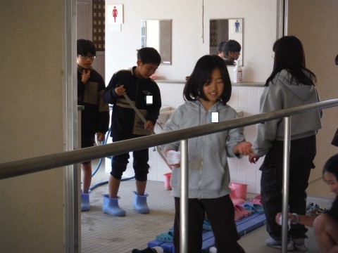 卒業式の準備を,5年生が中心となりおこないました。体育館やトイレ,廊下,玄関,教室とほうきでごみをはいたり,濡れたぞうきんでふいたり,水を流してキレイにしたりしました。隅々まで丁寧に掃除をしていました。