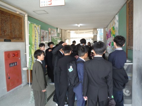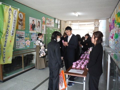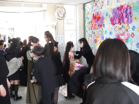 中央玄関では,登校してきた児童の胸元に,ピンクのコサージュをつけていました。「おめでとうございます!」との声に,照れながら「ありがとうございます。」と言っていましたよ。