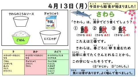 今日の給食の献立です!!今年度の給食がはじまりました。新しいクラスで決めた給食当番の役割をしっかりはたしてくださいね。今日もおいしくいただきます!!