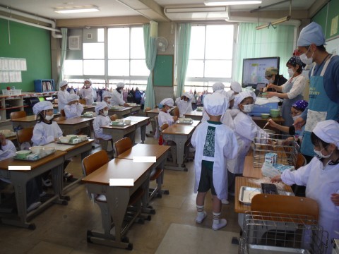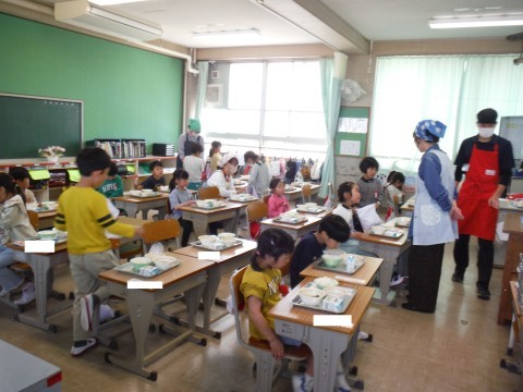 給食がはじまり2日めとなりました。自分でエプロンに着替えようとがんばっていました。しっかりよく噛んで食べてくださいね。少しずつ小学校の給食に慣れてくださいね。本日も1年生の保護者のボランティアのみなさんにご協力いただきました!!ありがとうございました。