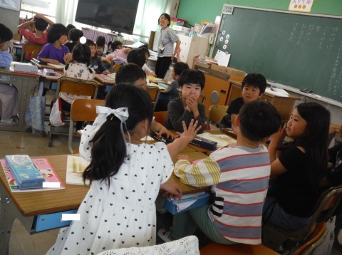 (上の写真)国語の時間の様子です。今日は,「ふきのとう」のお話の内容が伝わるようにグループで役割分担をしていました。(中の写真)算数の時間の様子です。今日は,黒板に貼ってある具体物を操作しながら,10より大きな数のたし算について考えました!!(下の写真)こちらも,算数の時間の様子です。10より大きな数のたし算について,ブロックを使いながら確かめていました。