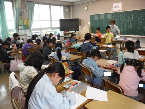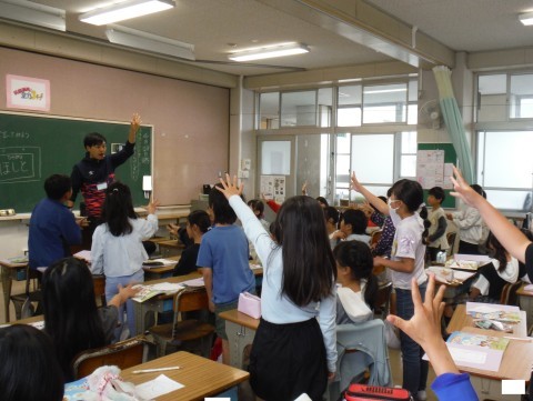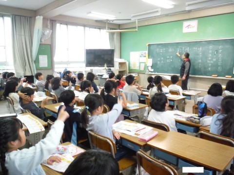 (上の写真)外国語活動の時間の様子です。英語を使ってじゃんけんをし、自分の名前を英語で紹介する活動に取り組んでいました。(中の写真)こちらでは朝の会の続きをしていました。健康チェックをしていました。みんなの元気な声が聞こえてきました。(下の写真)国語の時間の様子です。新しく学ぶ漢字の書き順や読み方,使い方などをみんなで確認しながら学習を進めていました。