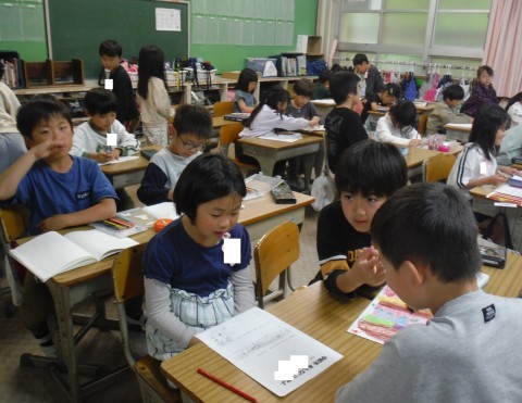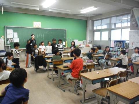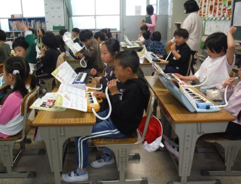 (上の写真)音楽の時間の様子です。今日は,ちょうど鍵盤ハーモニカで演奏していました。タンギングを使って,音を切る練習をしました。(中の写真)こちらでは,図工の鑑賞や昨日の学校たんけんについて思い出しながらまとめていました。(下の写真)こちらでは,みんなでじゃんけんをして勝ち残りを決めていました。とってももりあがりました。