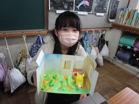 自分で選んだ物語の一場面を絵や粘土を使って表現しています。