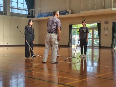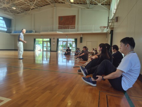 今日の放課後、体育館で教職員対象に、警察官OBの方に来ていただき。不審者対応訓練を行いました。
