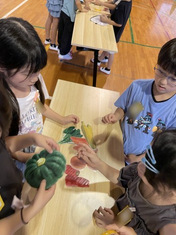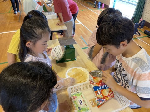 はかりを使って一回に食べるとよいポテトチップスの量をはかったり、おやつに使われている野菜あてゲームをしたりしました。