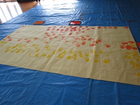 5年生との共同制作で,まずはひまわり学級のお友だちの手がたが模造紙いっぱいに広がりました。