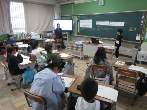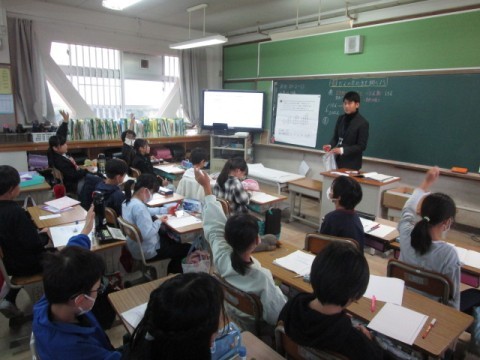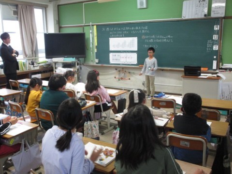 算数では正方形を階段状に積み重ねて,階段の段数と周りの辺の数の関係を調べました。