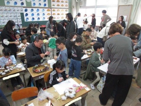 図工では,拾ったどんぐりや飾りをつけて,アサガオのリースづくりをしました。