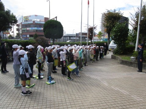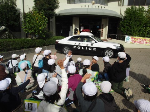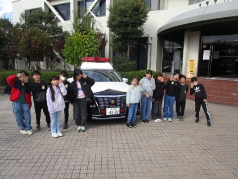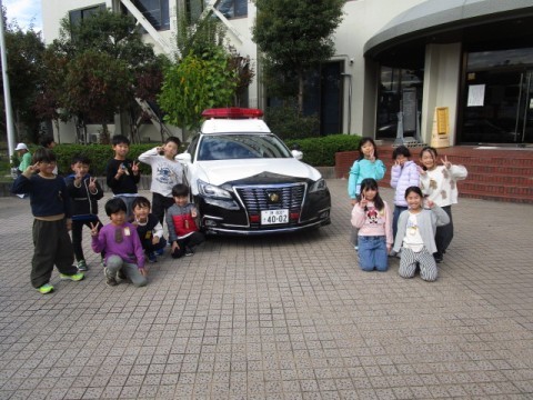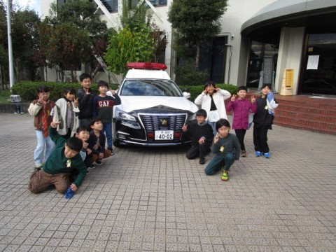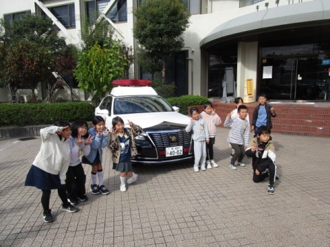 パトカーの前で記念写真を撮り,出動する警察官を見送りました。