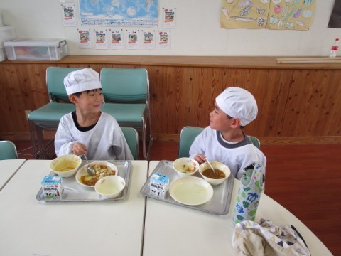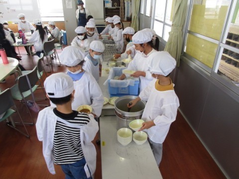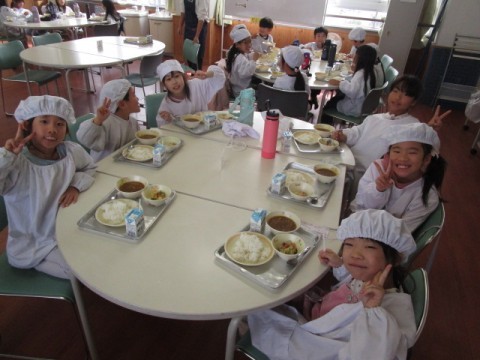 教室とは違う場所で友だちと一緒に食べる給食は,いつもより美味しく楽しい時間だったようです。