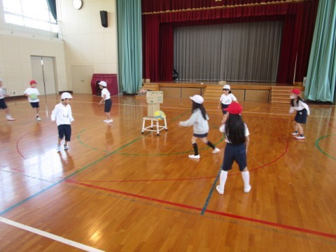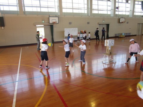 真ん中の段ボールをめがけて,サークルまとあてゲームをしました。
