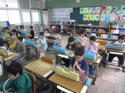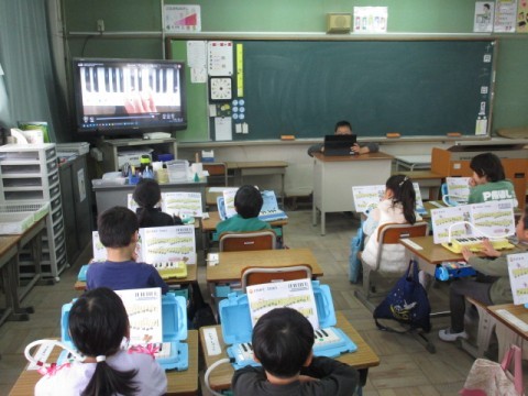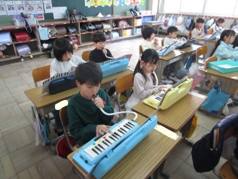 先生の見本をみて,指使いに気をつけながら練習をしました。
