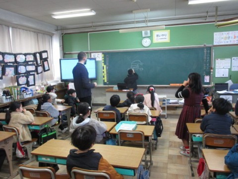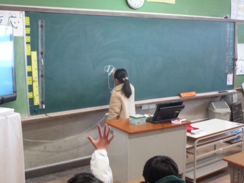 黒板に描いている絵を考えますが,描き始めたらすぐにたくさん手が挙がっていました。