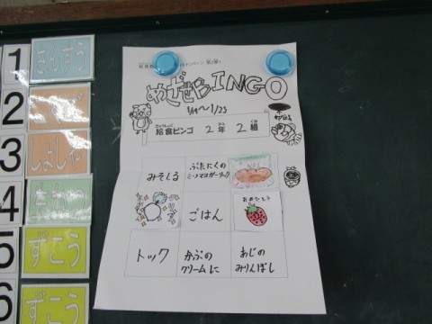 教室には,給食BINGOの掲示があり,2日目にしてリーチだそうです‼
