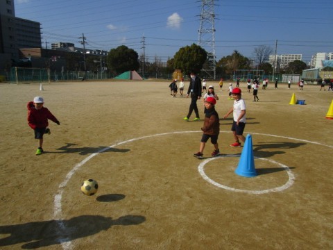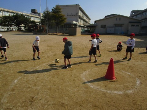 真ん中のコーンにサッカーボールを当てたら点数が入ります。
