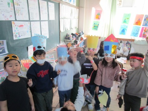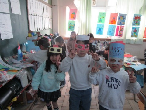 1年生 図工 公開日 2026/02/17 更新日 2026/02/17 1年生 王冠・マスクなど,カッコいいものから可愛いものまで,好きな形・色で作っています。出来上がりを見せたくで,カメラを向けると笑顔でポーズしてくれました。 1年生