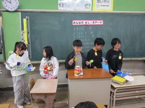 自分たちで作った楽器で,「オン・ステージ」を行いました。