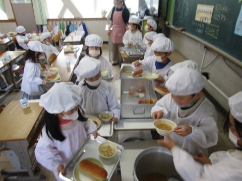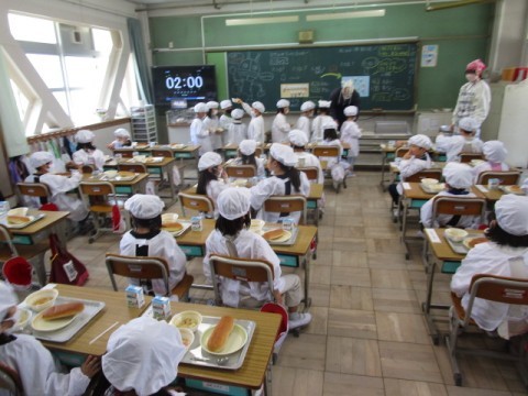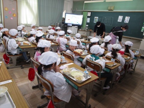 「いただきます!」と笑顔いっぱいで,給食を食べ始めました。「おいしい」と声があちこちから聞こえました。