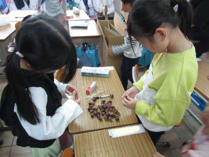 どんぐりゴマを作ったり、段ボールを使ったり、大泉緑地で拾ったもので秋のおもちゃ作りが始まりました。友だちとも相談しながら、楽しく活動できています。