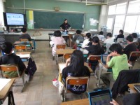 小学校で過ごす最後の授業時間です。黒板に寄せ書きをしたり,iPadを初期設定した...